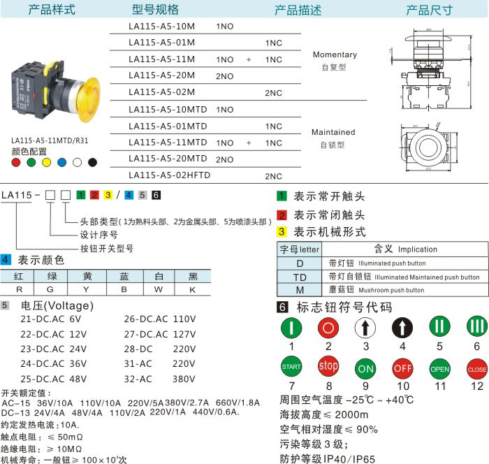 首页 产品中心 按钮系列 LA115-A5按钮系列 带灯蘑菇钮(自锁型/自复型)