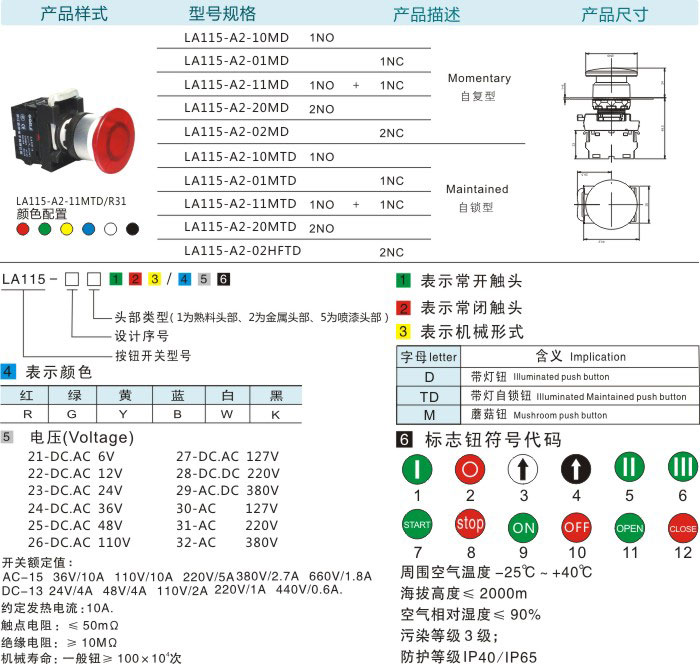 首页 产品中心 按钮系列 LA115-A2按钮系列 带灯蘑菇钮(自锁型/自复型)