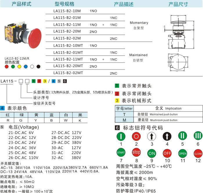 首页 产品中心 按钮系列 LA115-B2按钮系列 蘑菇钮(自锁型/自复型)